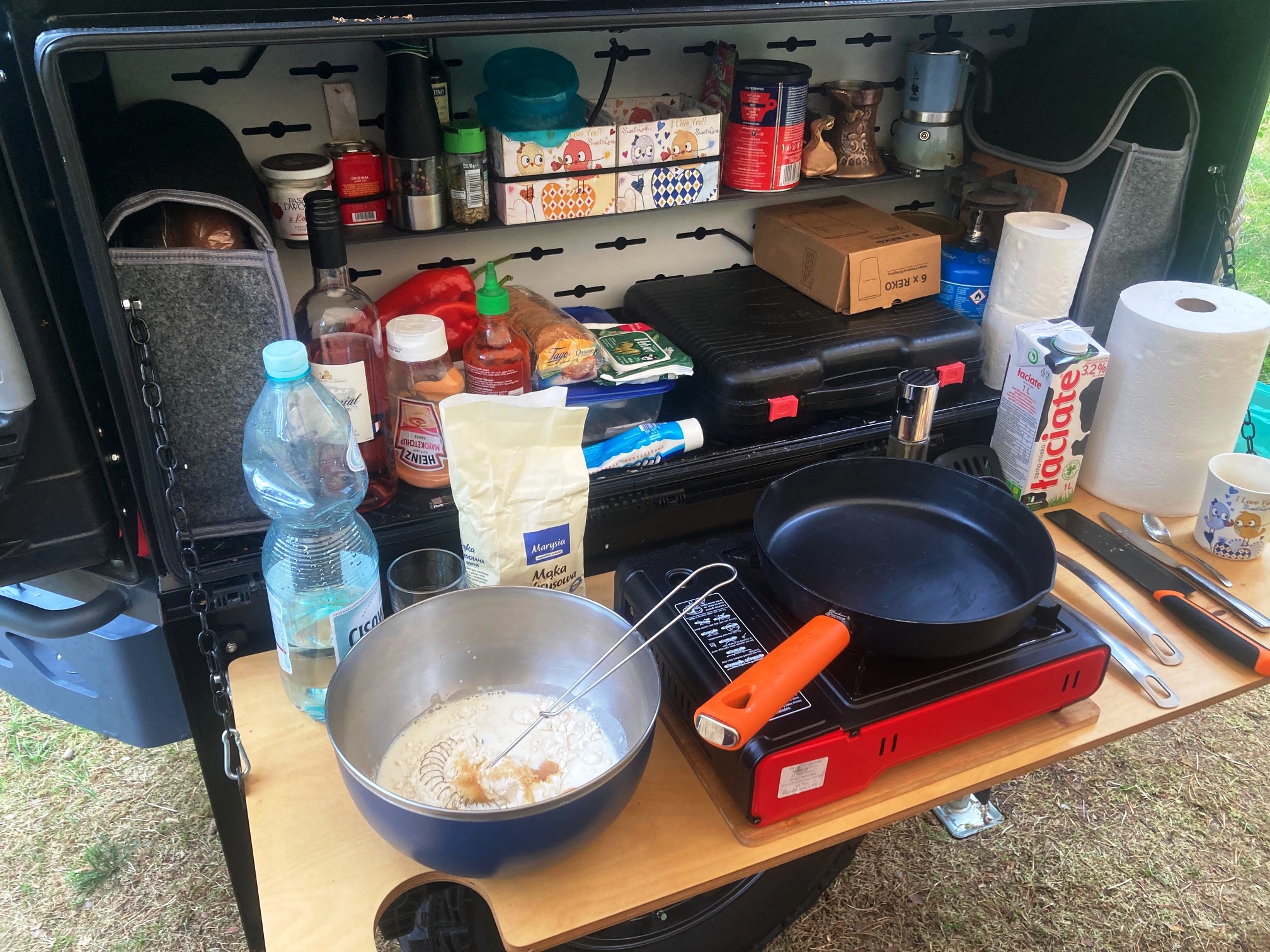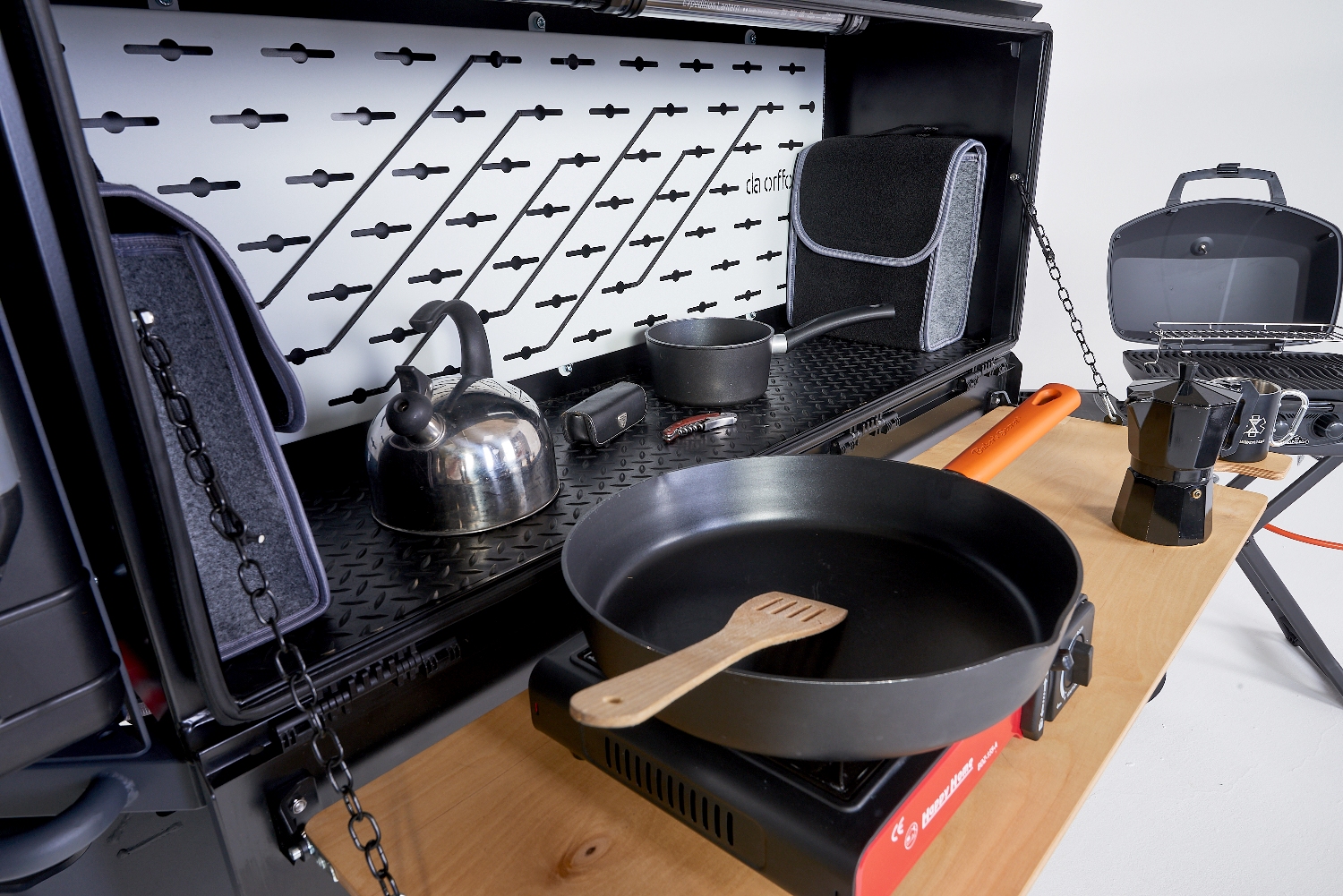 Szczelny kufer wyprawowy o funkcji biwakowej kuchni może być zamontowany na przyczepie, pickupie, na ścianie domu lub w ogrodzie. Służy do bezpiecznego mocowania, przechowywania i przewożenia zapasów, naczyń, sztućców i sprzętu biwakowego np. kuchenki, kartuszy etc. Drzwi rozwierane w dół, zamykane dwoma klamkami z zamkami na jeden klucz.