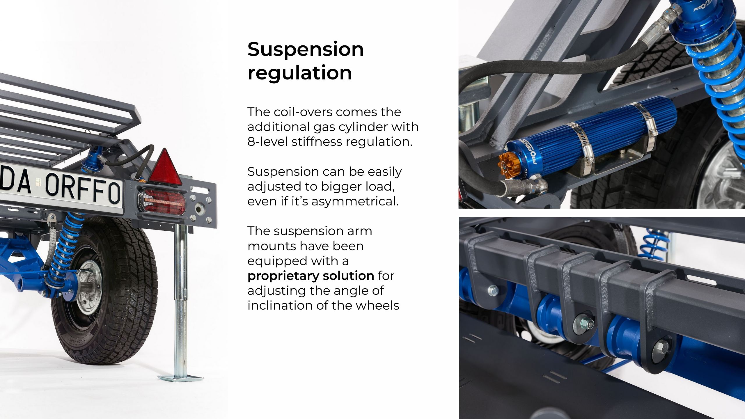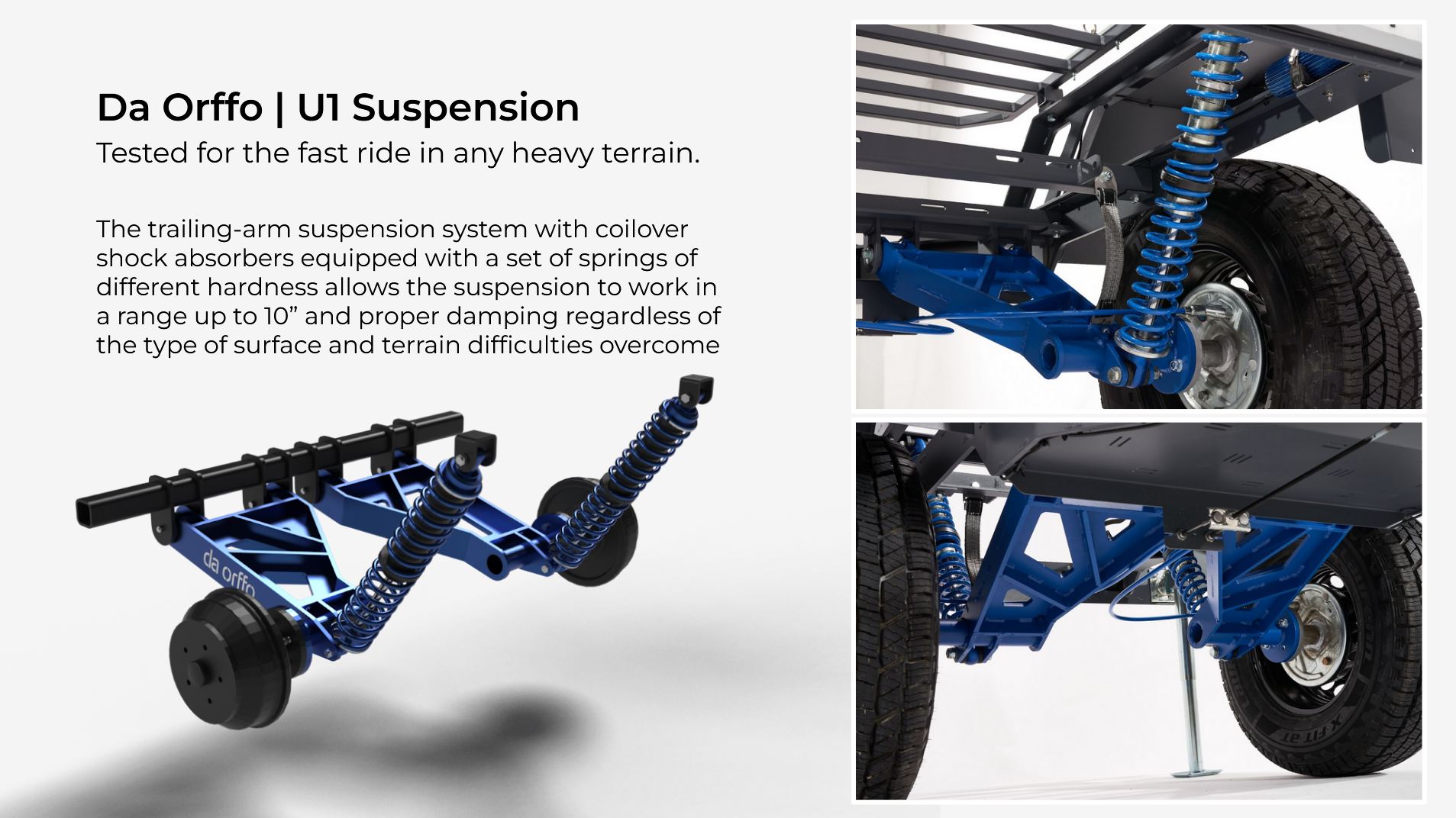 System zawieszenia umożliwia pracę w zakresie do 250mm, regulację kąta pochylenia koła względem płaszczyzny pionowej oraz ośmiostopniową regulację charakterystyki amortyzatorów. System przeznaczony do jazdy sportowej, sprawdza się w szerokim zakresie obciążeń zarówno na drogach szybkiego ruchu jak i w terenie. W każdym przypadku większa bezpieczeństwo holownika i zabezpiecza ładunek w przyczepie. Zapewniamy dobór sprężyn i wstępne ustawienie zakresu siły tłumienia amortyzatorów do zakładanego obciążenia. System stosowany w przyczepach DA ORFFO o dopuszczalnej masie całkowitej 750kg. Testowany w trudnym górskim terenie.