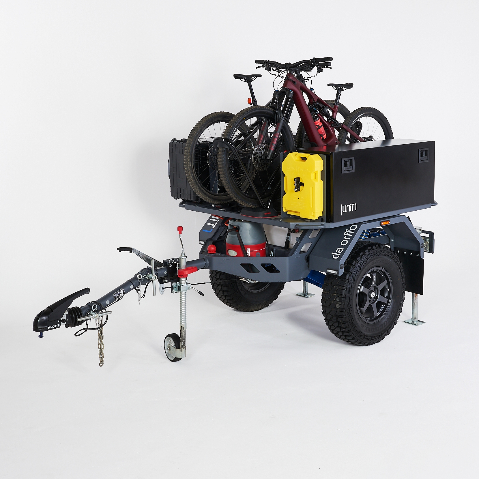 U1 eBIKE to terenowy mini-kamper z opcją transportu dwóch rowerów elektrycznych. Konfiguracja przyczepy UNIT 1 z zestawem modułów SPORT i dwoma uchwytami rowerowymi. W zestawie: